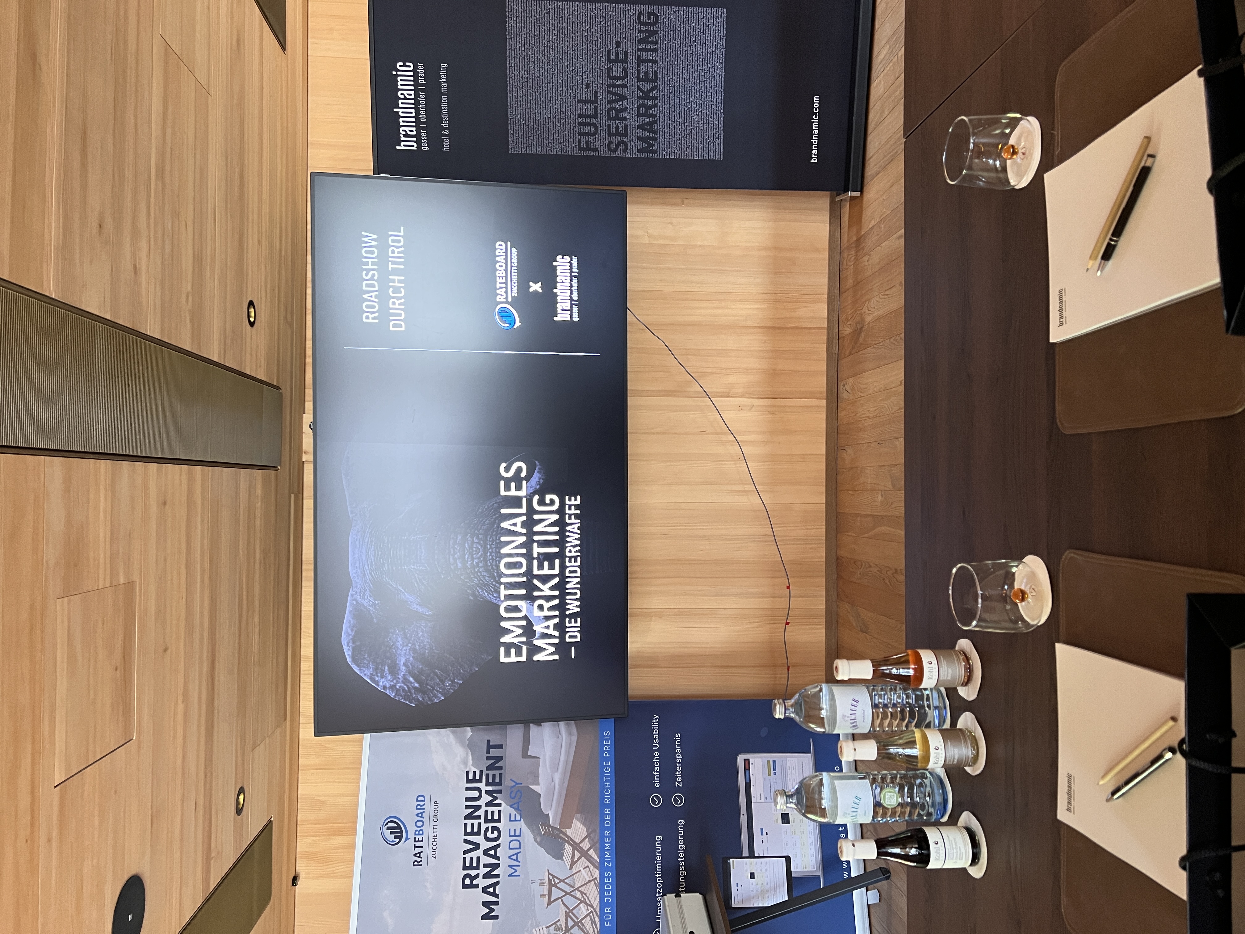 Ischgl, Innsbruck, Kitzbühel und Zell am Ziller: Das waren die Ziele der gemeinsamen Roadshow von Brandnamic und der Software-Firma RateBoard. Die teilnehmenden Hotelierinnen und Hoteliers lernten in einem informativen Vortrag, wie sie mit emotionalem Marketing den Gast für sich begeistern und mit dynamischen Preisen ihren Umsatz maximieren. Denn eins ist klar: Dynamische Preise sind heute in einem modernen Betrieb nicht mehr wegzudenken.