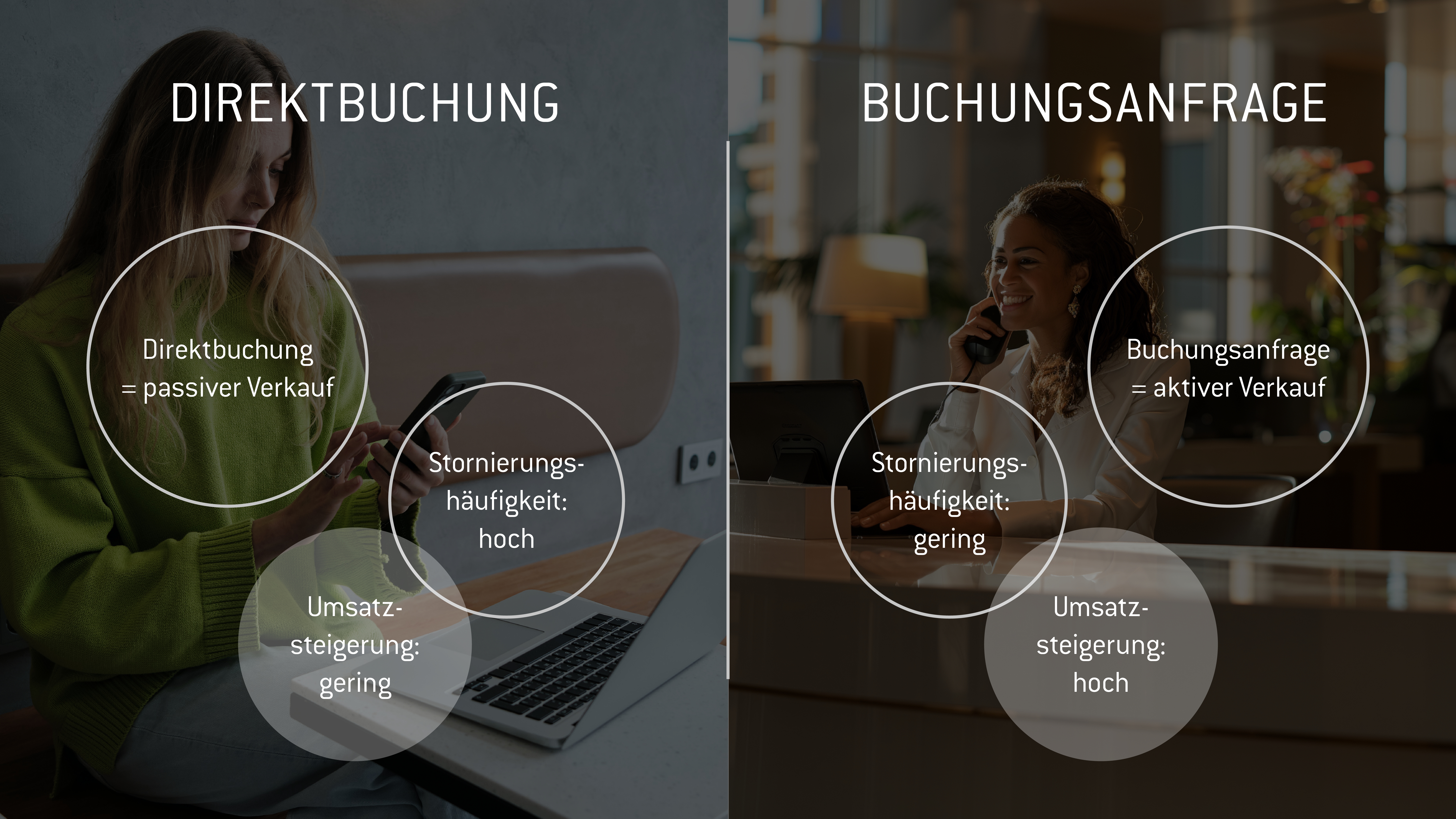 Allerdings gehen mit dieser passiven Verkaufsstrategie auch einige erfolgsentscheidende Nachteile einher. Zum einen kann es vorkommen, dass Gäste buchen, die nicht ideal zu Ihrem Hotel mit seinen Leistungen und seiner Philosophie passen und die folglich möglicherweise nicht zu 100 % auf ihre Kosten kommen – sprichwörtlich. Zudem bleiben interessante Details über die Gäste oft unbekannt, z. B. Erwartungshaltung, Vorlieben und Anlass der Reise. Zum anderen ist die Möglichkeit des Upselling begrenzt, da Zusatzleistungen oder Upgrades seltener gebucht werden. Natürlich ist es möglich, im Anschluss an eine Direktbuchung aktiv auf die künftigen Gäste zuzugehen, um im persönlichen Kontakt die Buchung zu optimieren. Jedoch ist der Buchungsprozess für die Gäste zu diesem Zeitpunkt gedanklich schon abgeschlossen und die Bereitschaft, sich erneut damit auseinanderzusetzen, gering – und es besteht die Gefahr, dass Gäste die als sicher betrachtete Buchung in Zweifel ziehen.