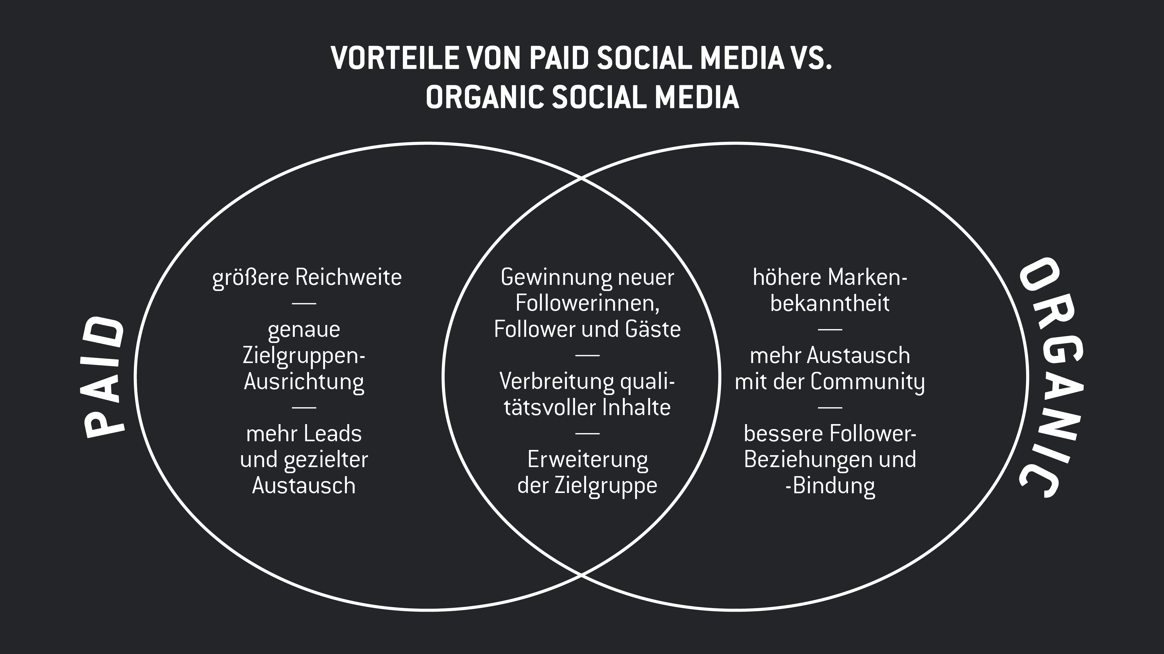 Voraussetzung für den Erfolg ist eine Social-Media-Strategie, die zur Erreichung der Marketing- und Geschäftszielen beiträgt. Diese beinhaltet immer beide Komponenten: organische und bezahlte Posts, denn beide dienen einander. Cleverer organischer Content ermöglicht es, kostengünstig zu werben. Paid Social Media trägt andererseits zur Zielerreichung bei und hilft gleichzeitig, eine qualifizierte Followerschaft aufzubauen und zu binden.