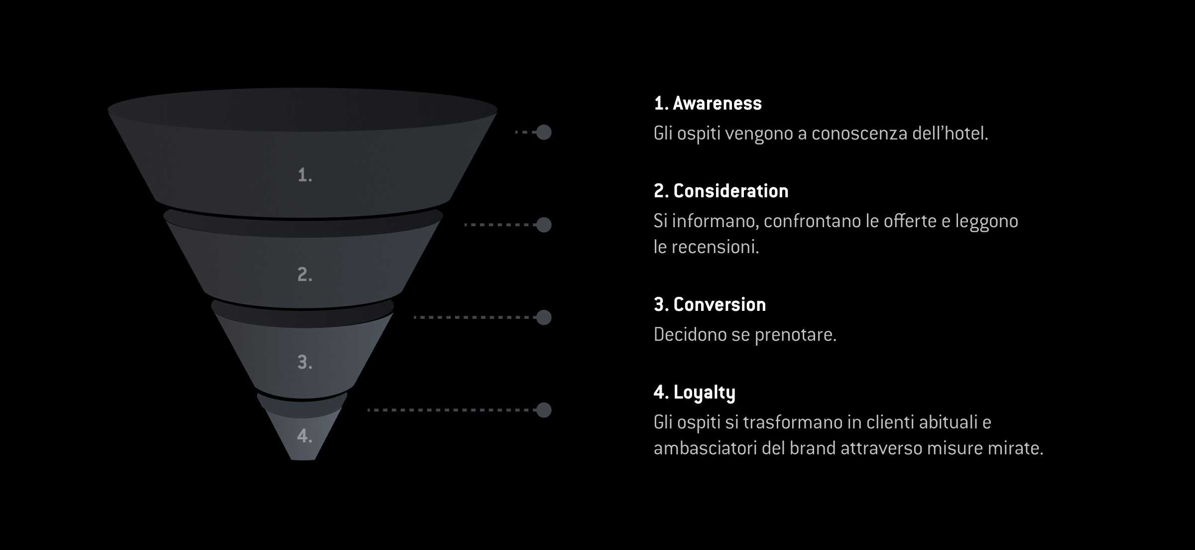 Il termine “funnel” (dall’ingl. “imbuto”) ne descrive in modo figurato il principio: un gran numero di potenziali ospiti entra nell’imbuto dall’alto, ma solo quelli che effettivamente prenotano escono dal fondo. A mano a mano, il numero diminuisce fino a quando la persona interessata diventa un ospite pagante.