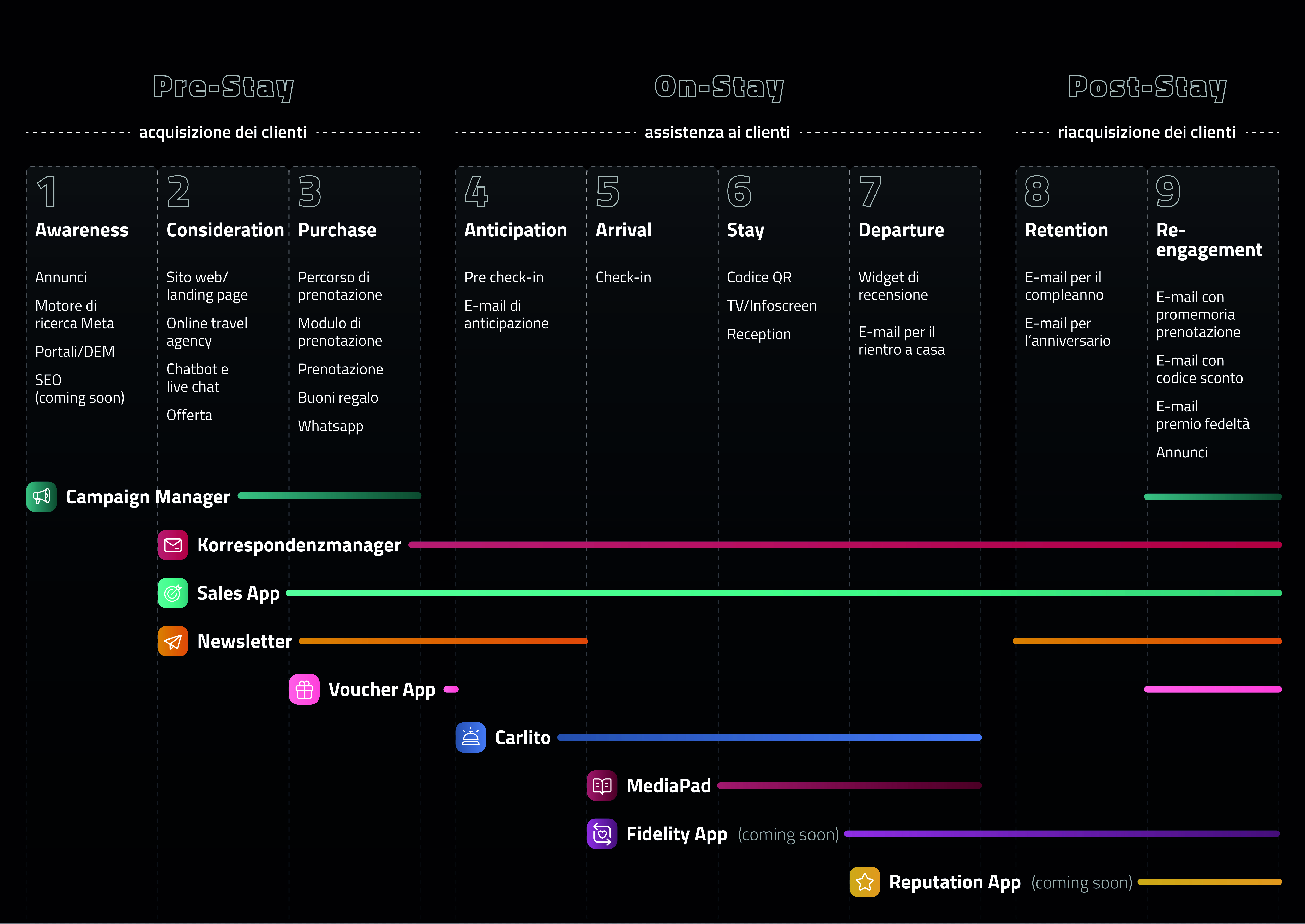 Per utilizzare in modo ottimale il Campaign Manager come parte del Marketing Cloud, è necessario utilizzare le Brandnamic Hotel Apps, composte dalla DataHub App come piattaforma di gestione dei dati, dalla Cluster App per la segmentazione dei profili degli ospiti, dalla Privacy App, che garantisce la conformità della comunicazione alla GDPR, dalla Content App per una gestione efficiente dei media e dalla Payment App per transazioni di pagamento sicure.